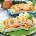Листики капусты украсьте тонкими дольками яблока и апельсина, выложите на дольки фруктов салат, украсьте зеленью (у меня немного мяты) и подавайте к столу!