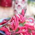 Приготовим соус. Отваренную свеклу крупно нарежьте и положите в блендер. Добавьте к свекле орехи (у меня обжаренный арахис, можно фисташки или грецкие орехи), раздавленный чеснок и перемелите в однородную массу.