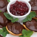 Приступаем к сборке: на печенье выкладывает маленькую ложечку клюквенного соуса, поливаем сверху теплым шоколадом и оставляем минут на 10, чтобы шоколад застыл.
