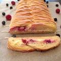 Охлажденное тесто делим на 2 части. Каждую раскатываем в прямоугольник 30*25 см. Делаем надрезы под углом. Выкладываем сначала сырный крем (вот здесь я затупила немного. Сначала выложила крем, а потом стала переносить изделие на противень :))) Сверху выкладываем ягодки и "заплетаем" косу. Накрываем влажным полотенцем и даем постоять минут 30. Смазываем молоком (или желтком с водой, кому как нравится)