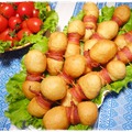 Беру кусочек теста, раскатываю в маленький кружок, кладу в середину брусок сыра. Соединяю стороны кружка (как при лепке вареников), хорошо защипываю их, закругляя края. Оборачиваю тесто с сыром ломтиком бекона, но не туго, закрепляю бекон зубочисткой.