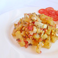 Когда картошка будет почти готова, добавляем к ней заправку, тщательно перемешиваем, солим. Уменьшаем огонь, накрываем крышкой и томим на сковороде несколько минут (до готовности).