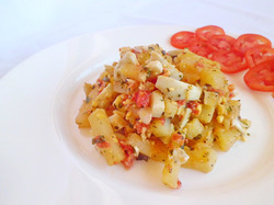 В это время очищаем помидоры от шкурки и зерен, мелко нарезаем. Добавляем к ним натертый на терке чеснок, базилик, петрушку и яйца, нарезанные не очень крупно.