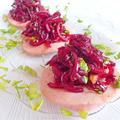 В отдельной посуде смешиваем обжаренный лук (он должен остаться немного хрустящим), натертую на терке свеклу, мелко нарезанную петрушку и грецкие орехи. Солим и перемешиваем. Подаем на кусочке колбасы.