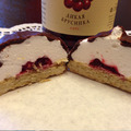 Начинаем взбивать белки, постепенно добавляя сахарную пудру. Существует два классических варианта приготовления крембо - ванильный и кофейный. На данном этапе в первом случае можно добавить ванильный сахар, во втором случае растворимый кофе (0,5 ч. л). Либо не добавлять ничего, как я, т. к. мои "головы негра" будут с небольшим отступлением от классического рецепта. Когда белки превратятся в пышную белую массу, добавляем желатин и продолжаем взбивать до устойчивых пиков. Перекладываем массу в кондитерский мешок и отправляем буквально на 5 минут в холодильник. Этого времени нам будет достаточно, чтобы на середину каждого печенья выложить по 1 чайной ложке соуса из дикой брусники - этого ингредиента нет в классическом крембо. Начинаем отсаживать крем вокруг соуса, чтобы получилась горочка. Получившиеся заготовки пирожных отправляем в холодильник для застывания желатина. Моим потребовалось минут 20.