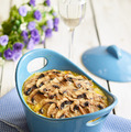 3. В форму для запекания (у меня объем 700мл) на дно выложить немного соуса, сверху ломтики грибов. Затем слой фарша, грибы, соус, сыр, фарш и т. д. Слои можно чередовать как нравится.