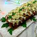 Выпекать рулет в предварительно разогретой до 200С духовке, в течение 30-40 минут. Дать рулету немного остыть и аккуратно снять пергамент. Я украсила сеточкой майонеза и сверху посыпала мелко натертым сыром.
