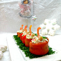 Морковь свернуть в колечки-стаканчики, скрепить половинкой зубочистки. Наполнить стаканчики начинкой, украсить зеленью и креветкой. Охладить и подавать.