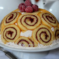 Стеклянную миску 22 см. застелить пищевой пленкой. Рулет нарежем на колечки примерно 2 см. и выстилаем ими дно и бока миски. Выкладываем сверху наш крем. А в середину еще один слой рулета. Выкладываем весь оставшийся крем до края миски. Выравниваем и ставим в холодильник на 3-4 часа. Охлажденный торт переворачиваем на блюдо, снимаем пленку. Украшаем малиной.
