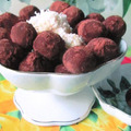 В две мисочки насыпаем какао-порошок и кокосовую стружку. Из теста лепим шарики и по 6-7 штук складываем в мисочки.