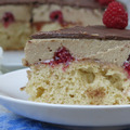 Наш бисквит уже давно готов. Его нужно достать из формы и дать ему остыть. У меня получился с небольшой горбинкой. При желании её можно срезать ножом, чтобы выровнять поверхность. Я этого делать не стала. Остывший бисквит укладываем в разъемную форму, смазываем джемом и сверху на джем "приклеиваем" ягодки малины.