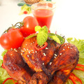Давим чеснок ножом, мелко крошим базилик, мяту. Отмериваем стакан томатного сока. Соединяем специи, соль, сахар и оливковое масло, соевый соус, заливаем всё томатным соком. Хорошо натираем курицу и оставляем мариноваться минимум на 4 часа. После маринования курицу протереть, маринад процедить.