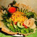 Тарелку из лаваша застелить листьями салата. Выкладываем весь салат. Сверху высыпаем оставшуюся кукурузу.