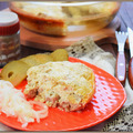 Выливаем омлет на мясо. Ставим форму (у меня стеклянная, поэтому я поставила в холодную духовку), выставляем температуру 200°С и выпекаем 40 мин. Ориентируйтесь по своей духовке! Достаем готовое блюдо и незамедлительно подаем к столу!