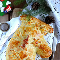 Из теста вырезать 2 рукавички, прибавляя к краю припуск на защипы. Одну рукавичку выложить на пергамент на противень, наполнить начинкой горкой, отступая от края. Вторую рукавичку чуть раскатать больше, накрыть ею первую и хорошо защипнуть края, используя вилку. С помощью плунжеров или подходящих форм вырезать из остатков теста фигурки и украшать рукавичку в зимнем стиле (места склейки смазывать взбитым яйцом). Из остатков начинки и теста можно сформировать произвольные слойки (остается и того, и того совсем немного). Смазать пирог взбитым яйцом, елочку посыпать кунжутом.