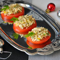Кладём кружки помидоров на сервировочное блюдо (тарелку), на помидор кладём полную ложку начинки, украшаем зеленью, у меня петрушка. Подаём закуску охлаждённой.