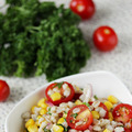Для приготовления салата крупу необходимо отварить и остудить. В чашку выложить перловку. Добавить кукурузу и черри, разрезанные на половинки. Добавить лук, нарезанный четвертькольцами, рубленую петрушку.