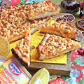 Из остального сделать основу руками в форме (24 см на 17 см) на смазанном пергаменте. Сделать невысокие бортики. Наколоть дно вилкой. Перенести помягчевшие фрукты на тесто. Распределить равномерно. Достать кусочек теста из морозилки и натереть на крупной тёрке.