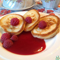 Пока готовился соус, тесто поднялось. Можно приступать к выпечке оладий. В сковороде разогреваем растительное масло и жарим оладьи. Готовые оладьи сервируем и сразу подаём к столу с малиновым соусом. Приятного аппетита!