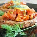 Я делала половину порции - получилось 4 шт. Лосось порезать кубиками 1х1 см. Корнишоны и лук порезать небольшими кубиками. Для заправки смешать кетчуп, растительное масло, сахар, уксус, гвоздику и лавровый лист. Лосось, лук и корнишоны залить заправкой, перемешать. Закрыть и убрать в холодильник на сутки. Режем хлеб. Достаем салат.