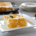 Распущенный желатин нагреть на водяной бане и теплым (но не горячим) влить в творожную массу. Затем ввести взбитые сливки так, чтобы они не осели. Апельсины очистить от кожуры, нарезать на кружочки. Прямоугольную форму выложить промасленной бумагой, по дну и стенкам положить кружочки апельсинов.