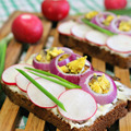 Покрыть шпроты колечками из лука. В колечки вложить раскрошенный желток. На другую сторону выложить тонко нарезанный редис. Украсить зеленым луком. Бутерброды готовы! А как это вкусно с пивом!