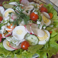 Овощную смесь выложить на плоское блюдо горочкой и слегка полить небольшим количеством заправки, украсить кружками яиц и, при желании, помидорками черри. Оставшуюся заправку подать отдельно в соуснике, чтобы каждый мог заправить салат по своему вкусу.