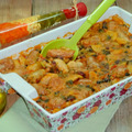 Порезать свиные и куриные колбаски. В форму для запекания выложить содержимое кастрюли и колбаски, порезанные кусочками. Поставить в разогретую до 180 градусов духовку и запекать 30 минут.
