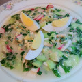 Теперь достаем из холодильника холодненькую минералочку и заправляем/разбавляем нашу окрошку до консистенции, которая Вам нравится. Украшаем дольками оставшегося яйца. Окрошка получается и нежной за счет огурчика и яйца, и пикантной за счет чеснока и аджики, и остренькой за счет редиса. Вкусно! Приятного аппетита!