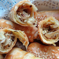 Кладем начинку на край узкой стороны теста, подворачиваем края теста по длине. Закручиваем пирожок, как показано на фото. Кладем пирожки на противень. Яйцо взбалтываем, смазываем пирожки и посыпаем кунжутом. Выпекаем 25 минут при температуре 220 градусов.