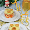 Дать настояться салату полчаса. Снять сервировочное кольцо и украсить салат. (по желанию) Я приготовила салат в виде мордочки хрюшки, символа наступающего года. Пятачок и ушки - это подсушенный хлеб, глазки - душистый зеленый перец. Все готово!