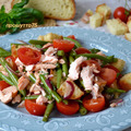 Для заправки смешать в мисочке растительное масло, красный винный уксус, соль и перец. Размешать до состояния эмульсии (с помощью вилки) и влить в салат... Свежие листики базилика мелко нарезать и тоже добавить в салат. Все осторожно перемешать.