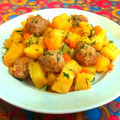 Пока тефтели в духовке, займёмся овощами. Нарезать небольшими кусочками лук. Нашинковать капусту. Морковь нарезать небольшими кубиками. Картофель нарезать кубиком 1,5-2 см. В глубоком казане на растительном масле поджарить лук с морковью, примерно 3 минуты. Затем добавить капусту, потушить под крышкой ещё минуты 3-4. Добавить картофель, поджарить периодически помешивая 5 минут. Посолить, добавить лавровый лист и душистый перец горошком. Перемешать.
