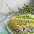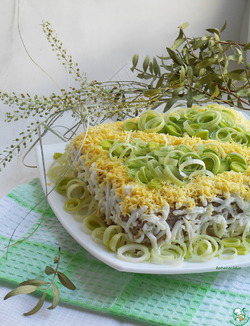 «Осевший» торт смазать сверху и по бокам оставшимся печеночным кремом. Украсить вареным яйцом и луком-пореем, они тоже отлично сочетаются с печенью.