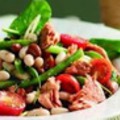 4 полоски копченого бекона 250 г зеленой фасоли 400 г банка консервированной белой фасоли, слитой и промытой 400 г банка консервированной красной фасоли, слитой и промытой 175 г порезанных на четвертинки маленьких помидор 3 ст. ложки оливкового масла 1 ст. ложка красного винного уксуса 2 ст. ложки зернистой горчицы 2 ст. ложки свежего базилика Обжарить на гриле бекон до хрустящей корочки, затем нарезать его на маленькие кусочки. Довести до кипения большую кастрюлю с соленой водой, добавить в нее зеленую фасоль и варить до мягкости. Слить и промыть под холодной водой. Соединить фасоль с беконом и добавить консервированную фасоль и помидоры. Добавить все оставшиеся ингредиенты, перемешать и сразу же подавать.
