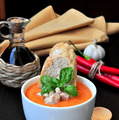Порезать овощи крупно, переложить в бдендер, добавить хлеб с лимонным соком, чеснок, морскую соль, перец черный молотый, оливковое масло и бальзамичексий укус. Добавить чили свежий по вкусу.