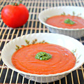 Все ингредиенты для песто пробить в блендере. Сложить песто в закрывающуюся емкость - хранить в холодильнике. Разливаем гаспачо по холодным тарелкам, в середину выкладываем по 1 ч л песто и наслаждаемся!