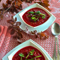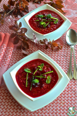 8. Добавить питьевую воду. Количество зависит от желаемой густоты супа. При необходимости добавить соли и перца. Убрать в холодильник на несколько часов. Подавать с кусочками огурца, свеклы и листьями мяты.