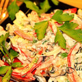 Петрушку промыть, очистить от жёстких стеблей, мелко покрошить. Лук слить на ситечко, чтобы стекла лишняя жидкость. Все ингредиенты сложить в большой салатник. Майонез выложить в пиалу, выдавить в него половинку лимона, посолить и заправить салат (лучше это сделать перед подачей).