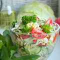 Все овощи помыть. Молодую капусту нашинковать тонкими полосками, огурец и помидоры нарезать произвольно.