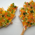 Даем изделиям остыть. Овощи моем и нарезаем на мелкие кубики. На листочек намазываем творожный сыр. Сверху выкладываем нашу нарезку.
