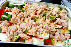 Запекать в разогретой духовки до 180С 30-35мин. до готовности. За несколько минут до готовности можно включить гриль. На горячие овощи раскрошить мясо тунца.