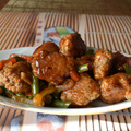 На сковородку, где жарились фрикадельки выложить нарезанный полукольцами лук. Обжаривать минут 5, затем выложить нарезанный болгарский перец и обжаривать еще минуты 2-3, затем стручковую фасоль и продолжать обжаривать минуты 2-3. Из лимона выдавить сок. Смешать его с терияки, томатной пастой, приправами.