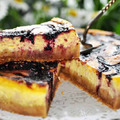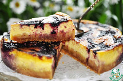 В форму с основой выкладываем заливку. Слегка встряхиваем. Сверху ложкой кляксами наносим сваренную с сахаром жимолость. Зубочисткой делаем рисунок. Ставим в нагретую до 160 градусов духовку на 60 минут.
