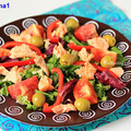 Семгу можно использовать как горячего копчения, так и запеченную или отварную. С копченой вкус будет более ярким. Вместо семги можно использовать другую красную рыбу, будет тоже вкусно. У рыбы удалить кожу и косточки, разобрать филе на кусочки и выложить на тарелку. Добавить оливки. Подавать сразу.