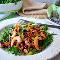 Перед подачей салата подготовить рукколу. Вымыть и как следует осушить. Добавить зелень к салату, перемешать и подавать!