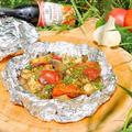 Для порционной подачи отрываем соответствующее числу едоков количество листов фольги, сворачиваем пополам. На каждый свёрнутый лист фольги кладём овощи, с расчётом на одну порцию. Сворачиваем овощи в фольге в конверт.