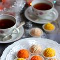 Смесь/тесто слегка остудить. Из приготовленного теста сформовать шарики равной величины по 30 гр. Для этого: сформовать круглую лепешку, на середину добавить орех фундук, затем сформовать шарик. Каждый шарик обвалять в цветной кокосовой стружке (можно использовать только белую стружку, все на ваш вкус).