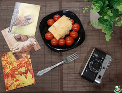 Третьим слоем выкладываем натертый на крупной терке - сыр. Готовый противень помещаем в предварительно разогретую до 180 градусов духовку на 40 минут. После вынимает и даем остыть при комнатной температуре в течении 5 минут. Приятного аппетита!