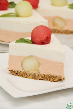 Для йогуртного крема смешать йогурт с лимонным соком (я не делала), добавить 200 мл сливок, 20 г желатина, распущенного в 100 мл воды, сахарную пудру 100 г. Вылить на застывший арбузный крем. Можно сделать этот слой тоже муссом, аналогично арбузному слою, то есть, когда йогуртная масса начнет застывать, вмешать осторожно взбитые сливки. Охлаждать торт в холодильнике 4 часа. Украсить торт арбузными и дынными шариками, листьями мяты и сразу подать.